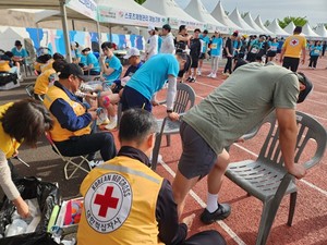 5000여명의 참가자들이 몰린 2025 평화의 섬 제주 국제마라톤 대회에서 소중한 생명을 살리기 위한 헌혈 촉진 캠페인이 추진됐다.대한적십자 제주특별자치도혈액원·제주다솜헌혈봉사회는 27일 2025 평화의 섬 제주국제마라톤 대회가 열린 제주대학교 대운동장에서 '헌혈 마라톤! 이제 시작입니다! 함께 헌혈합시다!' 캠페인을 진행했다.이날 헌혈 캠페인은 마라톤 대회에 기관과 기업, 학교 등 단체가 대거 참여한 만큼 단체헌혈 참여 등을 촉진하기 위해 마련됐다.특히 QR코드가 인쇄된 물티슈를 배부하면서 QR코드를 통해 레드 커넥트 어플과 헌혈
