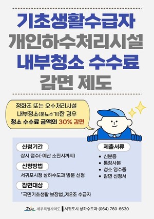 서귀포시는 경제적 취약계층의 부담 경감을 위해 개인하수처리시설 내부청소(분뇨수거) 수수료 감면 제도에 대한 홍보를 추진 중이다.개인하수처리시설 수수료 감면 제도는 '제주특별자치도 하수도 사용 조례' 제57조를 통해 '국민기초생활 보장법'에 따른 급여 수급자(생계·의료·주거·교육)는 정화조 또는 오수처리시설 내부청소 수수료의 30%를 감면받을 수 있다.감면을 희망하는 신청자는 신분증을 지참해 서귀포시청 상하수도과를 방문해 △감면 신청서 △청소 영수증 △통장 사본을 제출하면 된다. 신청은 업무시간 내 상시 가능하다.시는 감면 대상자가