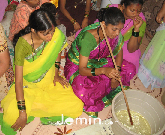 | 메가와디 지역의 부녀자들이 바닥을 닦는 세제를 만들고 있다. | ||