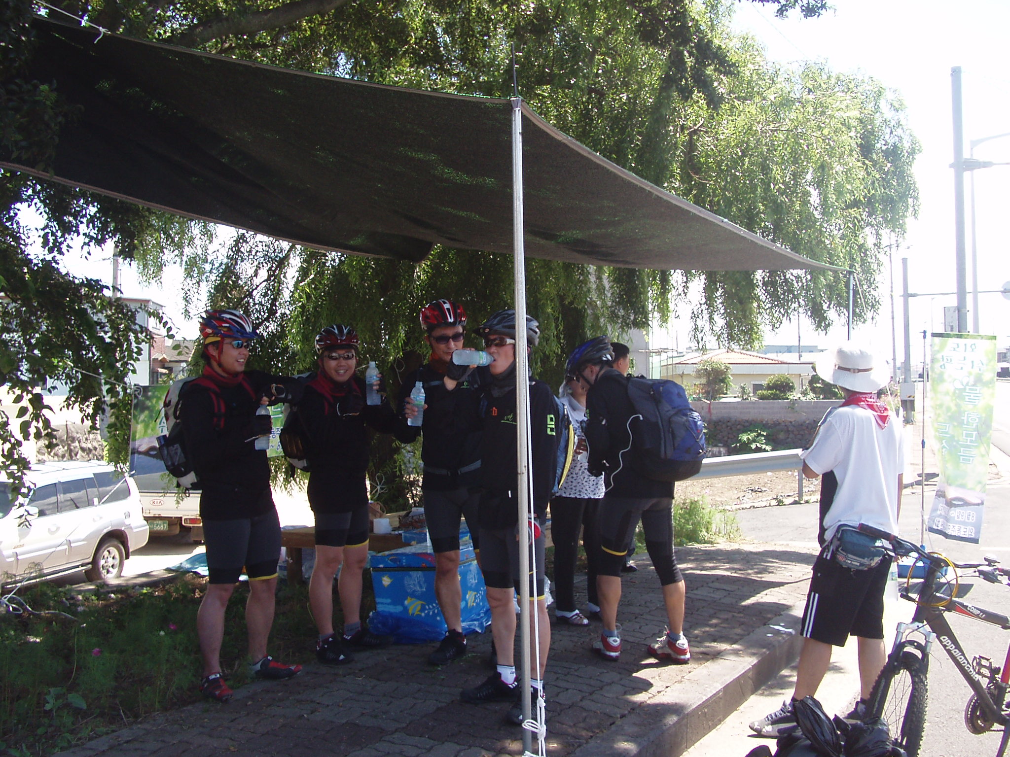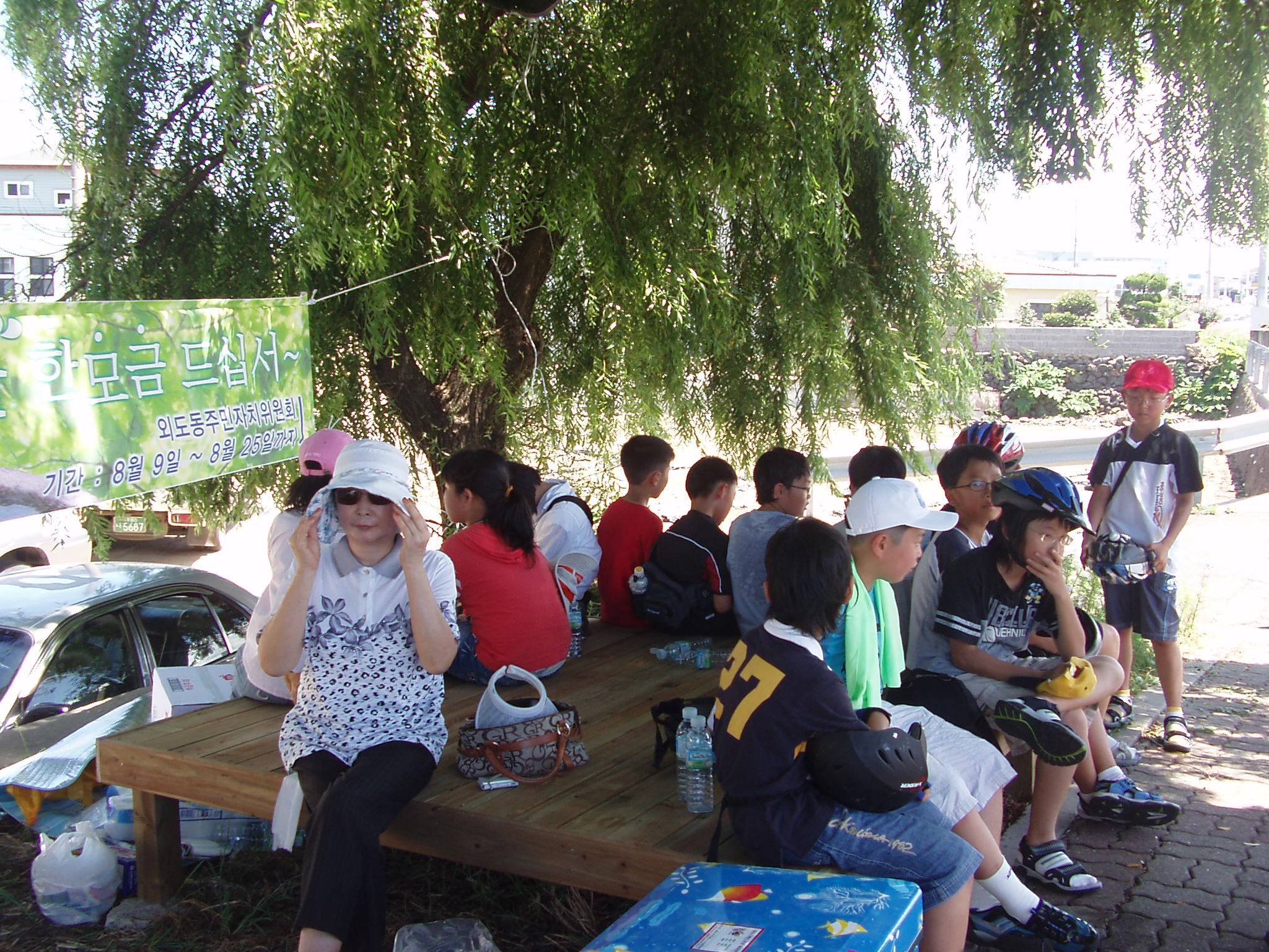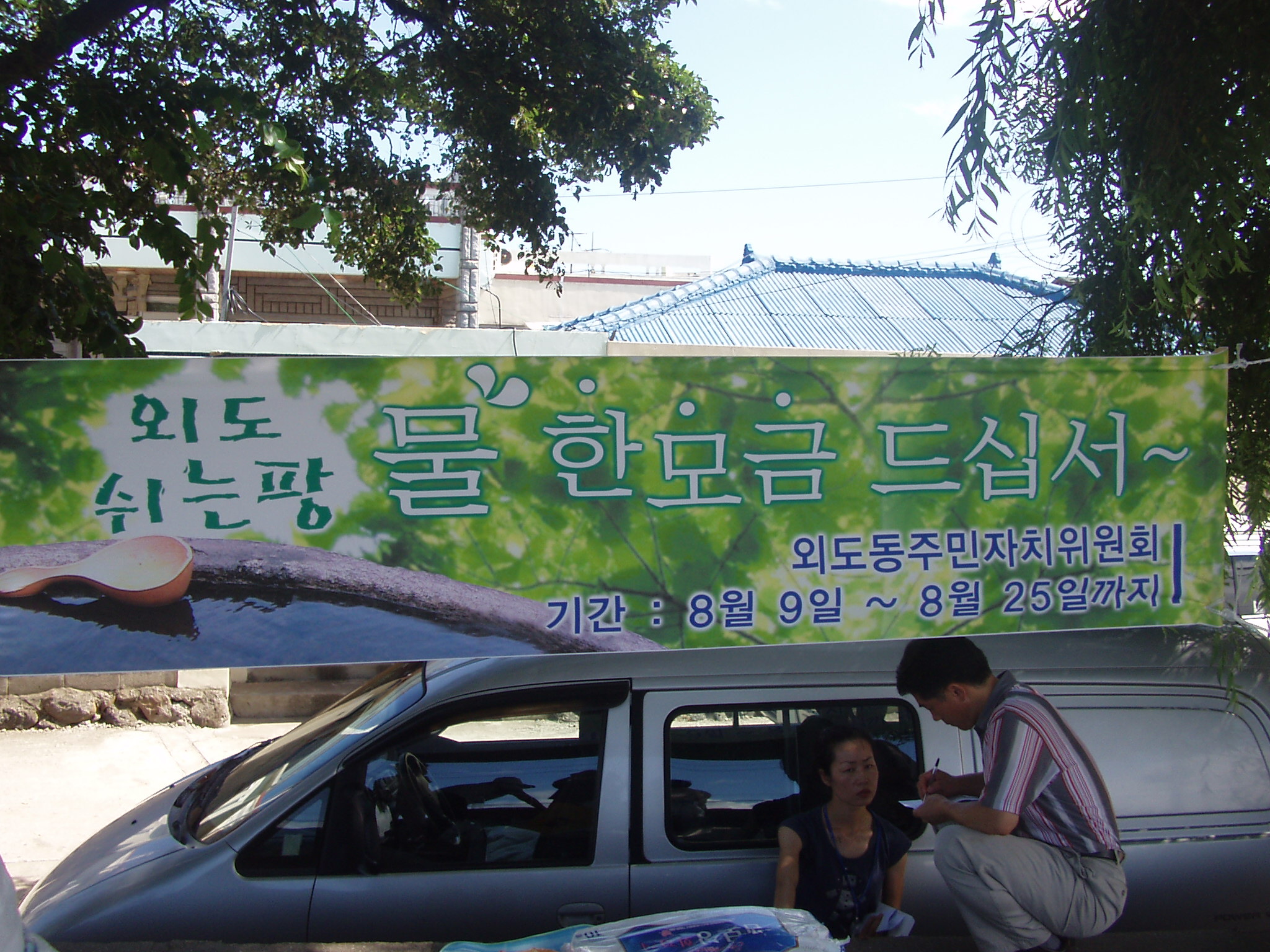 팽나무와 버드나무 아래 평상을 깔아 " 물 한 모금 드십서~ 외도 쉬는 팡 "이란 안내문을 내 걸고