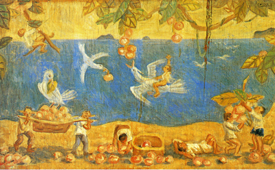 현실 외적 풍경을 그린 것이다. '열매 풍성한 바닷가'라는 것도 현실과는 거리가 먼 이야기지만, 저 멀리 수평선에서 이쪽으로 날아오는 새들이 아이들에게 열매를 따 주기 위해서 오고 있다는 것도 그렇다.