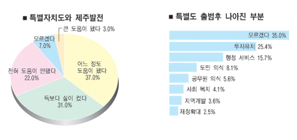 이는 본보가 6개월전(신년호)에 설문 조사한 이명박 정부 출범에 따른 특별자치도 추진 영향에 대해 설문자 중 64.8%가 긍정적인 영향을 미칠 것이다라는 결과와 크게 다르다. 이명박 정부의 규제 완화 전국화, 4·3위원회 폐지 추진, 특별자치도 핵심 권한 이양 미흡 등 여러 사안이 겹쳤기 때문으로 보인다.