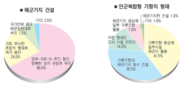 이와 함께 크루즈항과 해군기지를 동시에 건설해야 한다는 의견에 35.5%가 동의했고 어떤 형태든 군사시설은 안된다는 응답도 14%를 차지하는 등 군항에 대한 부정적 인식이 높았다.