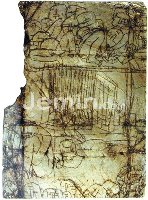 1952년 봄, 아내와 두 어린 아들이 부산에서 송환선을 타고 일본으로 간 뒤에 그린 것. 양담뱃갑 속에 든 은지(銀紙)를 꺼내어 그 위를 주머니칼 중에 있는 '송곳'으로 선각(線刻)한 뒤 번트엄버를 도포하고 헝겊으로 문질러 닦아냄으로써 패인 곳에 남은 유화물감이 선묘(線描)의 강한 느낌을 부각시키는 그림이다.