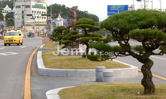 | ▲ 도로에 가로수와 조각작품을 이용해 중앙분리대를 만든 경북 김천시. | ||