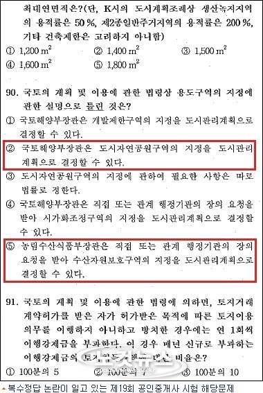 한국산업인력공단이 주관한 19회 공인중개사 시험 부동산 공법 90번 A형(B형 91번문제) 문제에서 정답이 2개라는 주장이 수험생들과 학원가로부터 제기되면서 큰 설득력을 얻고 있다.
