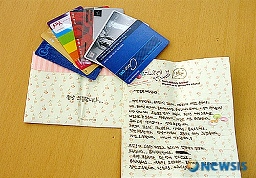 내용물은 다름 아닌 익명으로 보낸 용서를 구하는 편지 한 통과 신용카드, 지불카드 등 7개.