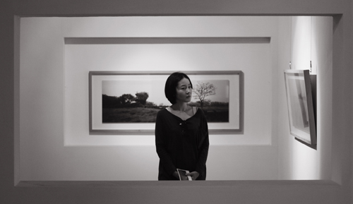 | 김영갑 갤러리 두모악을 둘러보고 있는 영화배우 엄지원. 김영갑의 작품세계에 대한 예우로 사진을 흑백처리하였다. | ||