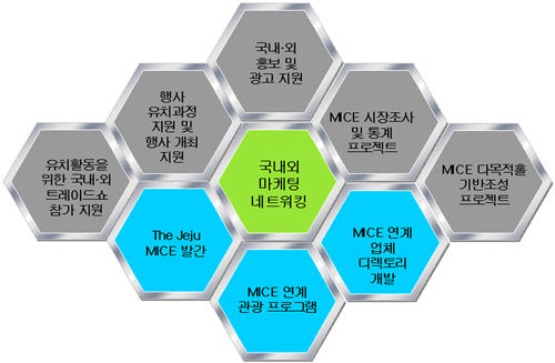 이들 사업을 위해 MICE산업 지원단을 비롯해 제주관광공사, 제주컨벤션뷰로, 제주특별자치도관광협회 등 주관기관 3곳과 제주국제컨벤션센터 등 핵심 참여기관이 협약을 체결했는가 하면 20명의 마이스산업 전담 인력을 확충했다.