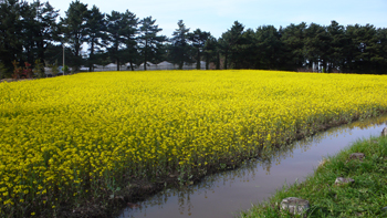 | 항파두리 항몽유적지 입구에 조성된 유채꽃밭의 노란빛이 눈부시다. | ||