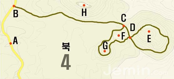 정상부 동쪽을 거쳐 남동사면을 시작으로 서면까지 능선을 따라 내려가면 다시 탐방로 입구 교차점(〃D)이다. 표고재배장 관리사를 출발한 지 약 50분이다. 이곳에서 표고재배장 쪽(〃C)으로 돌아가도 되고 정상까지 5분 밖에 걸리지 않아 '간식'처럼 부담 없는 샛궤펜이를 거쳐 섯궤펜이까지 갈수도 있다.