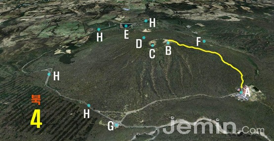 A=주차장 및 탐방로 입구 B=정상 C=분화구 D=토치카 E=어승생저수지 F=선녀폭포 G=어리목 삼거리 H=1100도로