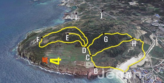 제주시에서 가는 길은 간단하다. 동회선 일주도로를 타고 가면 함덕리 해수욕장 동쪽 주차장(탐방로 지도 A)까지 17㎞다. 대부분 주차장과 가까운 서쪽으로 오른다.