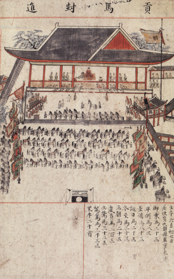 탐라순력도에는 ‘공마봉진(나라에 필요한 말을 고르다·숙종 28년 1702년)’이라 하여 나라에 필요한 말을 보내기 위해 각 목장에서 고른 말들을 제주 목사가 최종 확인하는 장면을 그리고 있다.