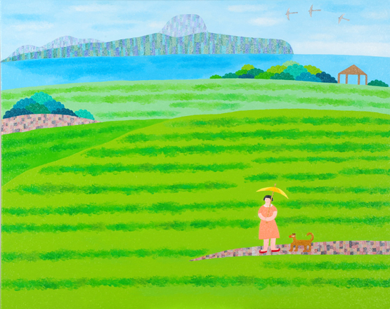 그러나 <청보리 축제>라는 작품에서 박정민의 시선은 청록색 물결의 보리들에 닿아 있다. 이 그림에서 축제를 벌이는 주체는 사람이라기보다 청보리에 있다. 청보리들이 바람의 결을 타며 축제를 벌이는 동안 관객은 달랑 두 명. 양산 쓴 소녀와 강아지 한 마리가 관객의 전부다. 멀리 새가 지나가고 바다 넘어 송악산이 보인다. 그 너머에 산방산은 우직한 청년처럼 서 있다. 박쥐 모양의 단산은 침묵을 지킨다.