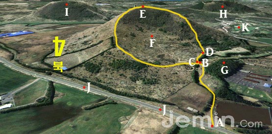 반시계방향으로 출발해 5분 정도 가면 나오는 갈림길(〃D)에서 왼쪽으로 방향을 잡으면 계단의 시작이다. 계단은 489개다. 계단을 다 오르면 오름 서쪽과 북쪽, 북동쪽 경관이 시원하게 눈에 들어온다. 타이어매트를 따라 5분 정도 올라가면 표고 466.1m의 정상(〃F)이다. 출발한지 25분 정도 걸렸다.