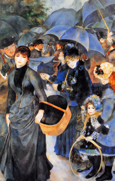 <우산>은 파리의 어느 봄날 야외로 나들이 하는 여인들의 모습을 그린 그림이다. 은회색과 청회색의 색상이 매우 아름다운 작품이다. 갑자기 소나기가 쏟아지고 나서 다시 보슬비가 내리는데도 자태를 흐트러트리지 않는 여인들의 발랄함이 돋보인다. <우산>은 19세기 후반 프랑스 산업사회의 평범한 일상을 보여주는 작품이다. 화면 상단에는 청회색의 우산으로 어둡게 가림으로써 우산 속의 인물들의 표정과 색상을 더 선명하게 드러내고 있다. 앞 좌측의 한 여인은 점원인데 윤곽선이 분명하면서도 단순한 아름다움을 보여준다. 르누아르는 평생 평범한 일상을 매우 중요시 여겼다. "나는 폼 잡지 않고 영원성을 간직한 그림이 좋다.....매일의 일상 속에서도 거리 한 모퉁이에도 일상성이 존재한다. 냄비를 닦다 잠깐 멈춰선 하녀의 모습도 올림푸스산의 주노 여신 못지않게 위대하다"(캐롤 스트릭랜드, 2000).