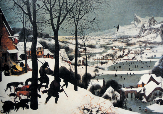 예전에 중학교 미술교과서에 눈 밭 위를 개들과 함께 걸어가는 사냥꾼을 그린 피테르 브뢰겔의 작품이 실려 있었다. 멀리 마을의 공터는 얼어붙었고 사람들은 그곳에서 스케이트를 타거나 춤을 추고 있고 몇몇은 쓰러져 있다. 흑백의 대비처럼 선명한 색채는 흰색의 눈과 녹회색의 하늘과 얼음으로 구분돼 있어 더욱 추운 겨울임을 느끼게 한다. 꿩이 나는 싸늘한 풍경, 온 세상이 얼어붙은 가운데 개와 함께 사냥을 다녀오는 사람들은 검은 색으로 그려졌다. 이런 그림의 유형은 중세 후기 귀족들의 기도서에 실려 있었다.