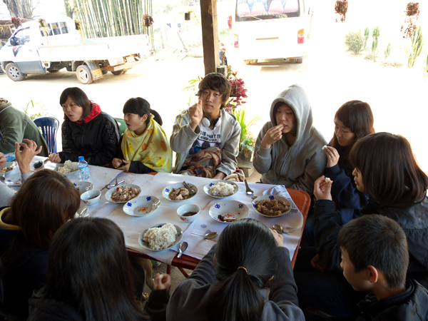 그래서 잔치가 벌어졌다. 우물이 생겼고, 마을이 생기고 처음으로 외국인 손님이 방문하였으니 잔치가 없을 수 없다. 돼지를 한 마리 잡는다 하여, 손을 보태는 의미로 한 마리 값을 내겠다고 했더니 한꺼번에 두 마리를 잡기로 했다. 동네 꼬마들과 눈을 맞추며 아내와 함께 마을을 돌아보는데, 곧 돼지를 잡을 거라는 소식이 전해졌다. 나운, 영준, 승현, 도솔, 서희 등 여행학교의 '중딩'들이 겁도 없이 돼지 잡는 광경을 보겠다며 몰려간다. 아내와 나도 따라갔으나, 결국 멱을 막 따려는 결정적 장면에서 고개를 돌리고 이장님 집으로 돌아왔다. '겁 없는 중딩'들은 생전 처음임이 분명한데도 남김없이 보고 와서 그 처참했던 광경을 생생히 중계하는 냉혹함(?)을 보여주었다.