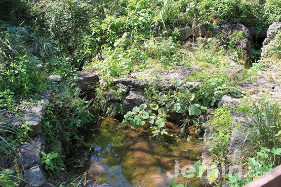 2개의 옹달샘을 한곳으로 모은 형태다. 과거처럼 수량이 많지는 않지만 지금도, 비록 '졸졸졸'이지만 계속 흐르고 있는데, 이게 불가사의다. 비고가 100m되지 않는 '조그만' 오름 중턱에서 어떻게 물이 마르지 않고 나올 수 있느냐는 것이다.