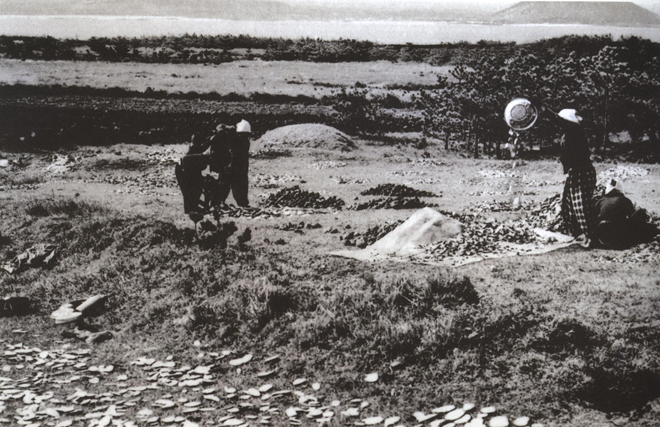 밧듸서 감저 파오기 전의 감절 오래 저장 구뎅일 파사 밧듸서 식거오는대로 묻을거난 구뎅이 파는 일이 저 일이다. 감저구뎅인 름으지에 물르지 안는 자릴 랑 크게 파는디 너비도 넓곡 짚이도 질은 파사 허는 거난 아칙부떠 물 때지 파사 다.