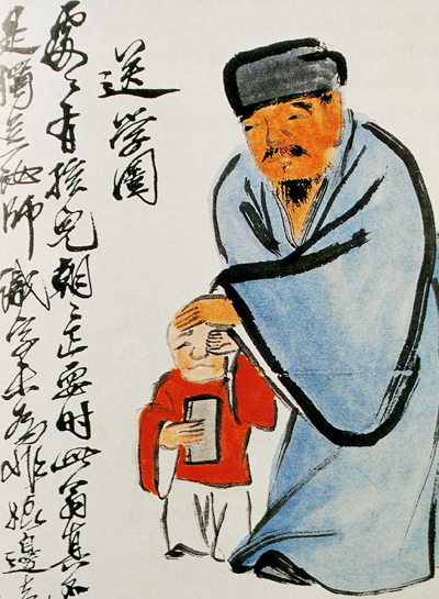 <송학도(送學圖)>는 손자를 학교에 보내는 장면을 그린 것이다. 학교에 가기를 두려워하여 우는 아이를 달래며 학교에 보내려는 할아버지의 인자한 표정에서 따뜻한 가족애와 해학적인 모습을 엿볼 수 있다. 과감한 필선은 빠르고 힘찬 간필(簡筆)의 묘법인데, 유머감과 암시는 제백석 인물화의 또 다른 특징이다. 제백석의 노년기 이후의 작품들에는 반복적으로 고향과 어린 시절의 추억을 화면에 강렬하게 표현하고 있다. 작품에 동심을 담고 있는 것은 말년에 이르러 고향을 추억하기 때문이다.