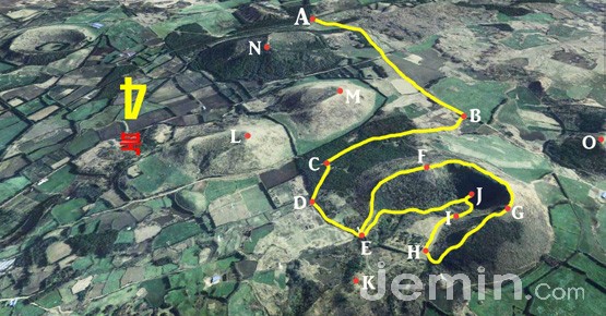 A=비자림로 상 입구 B=우회전 지점 C=좌회전 지점 D=탐방로 입구 E=오름 동쪽 입구 F=최정상 G=풍수적 정상(현무봉) H=오름 서쪽 입구 I=알오름1 J=분화구 K=알오름2 L=밧돌오름 M=안돌오름 N=거슨세미 O=거친오름
