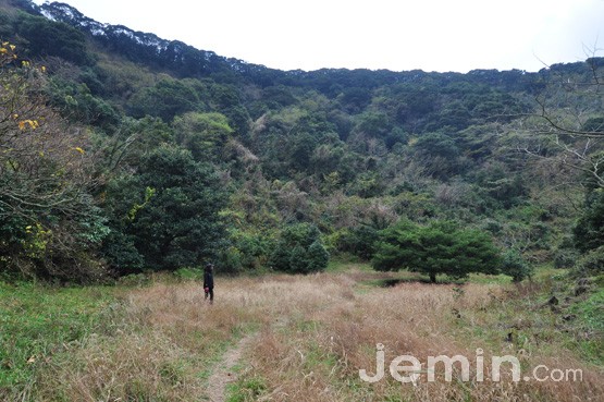 이제는 내려가는 길이다. 발길을 붙잡는 가시와 옷깃을 잡아끄는 나무들을 헤치고 5분을 가면 다시 개활지이고 본격적인 내리막길이다. 10여분이며 평지(〃H)다. 대략 1만3000㎡이다. 이곳에서 오름 중앙 방향으로 250m지점에 봉긋한 것이 알오름(〃I)이다. 풍수상으로 생기가 모인 주혈이라고 하니 비록 제주도에 있으나 일국의 수도 못지않은 '귀한 땅'인 셈이다.