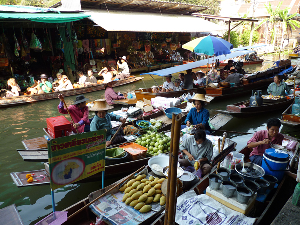 수상시장은 여러 겹으로 얽힌 수로를 따라 열대 과일과 해산물을 가득 실은 배들이 빽빽이 떠다녔다. 그 사이사이에 야채를 산더미처럼 쌓아놓은 배들이 끼어들었고, 가끔은 국수나 볶음밥을 싣고 다니면서 장사꾼들에게 한 끼 식사를 해결해주는 배도 보였다. 여행자들은 때로는 관광객용 배를 타고 때로는 다리를 넘나들면서 수상시장이 뿜어내는 들뜸 속으로 빠져 들고 있었다. 그대로의 전통 수상시장도 아니면서, 그렇다고 관광객에게 보여주고자 하는 그저 그런 시장도 아니었다.