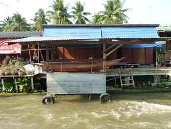 우리는 시장 끝머리에서 돌아서지 않고 수로를 따라 더 걸어 나갔다. 길은 사람이 딱 한 명만 걸어갈 수 있을 정도의 소로였다. 길모퉁이를 만나면서 두 번을 더 꺾어 돌았더니 갑자기 수상시장 풍경이 사라지고 수로 양쪽으로 가정집들이 나타났다. 예쁜 화분들이 가꾸어져 있고, 빨래가 바람에 날렸다. 집 안에서는 팬 선풍기가 돌았고 TV에서는 이 나라 가수가 노래를 하고 있었다. 내 뒤를 따라오던 승현이는 이 평범한 풍경들이 오히려 신기한지 그 특유의 구렁이 어법으로 자신의 느낌을 표현한다.