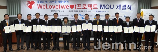 제민일보와 도내 14개 기관은 16일 오후 3시 제주도의회 도민의 방에서 후원·참여 기관장 등이 참석한 가운데 'We Love (We ♥)'프로젝트 성공적 추진을 위한 범도민 참여운동 동참 협약서를 체결했다.