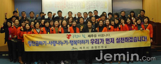 제주시 종합민원실(실장 고정렬)은 25일 오후 제주시열린정보센터 회의실에서 칭찬하는 조직문화 조성을 위한 결의대회를 갖고, 칭찬과 친절서비스 실천을 통해 신뢰받는 공직사회를 만드는데 앞장 설 것을 결의했다.