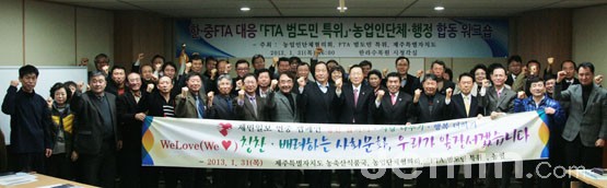 이날 결의대회에는 제주도농업인단체협의회와 FTA범도민특별대책위원회 관계자 등 40여명도 참석해 칭찬문화 확산에 힘을 보탰다.