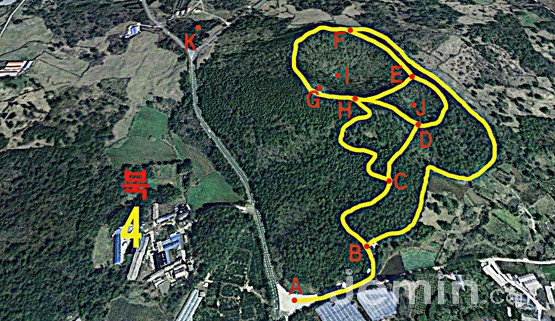 A=주차장 B=둘레길 갈림길 C=중턱 갈림길 D=작은 분화구 갈림길 E=분화구 사이 갈림길 F=둘레길 만나는 점 G=정상 H=큰 분화구 갈림길 I=큰 분화구 J=작은 분화구 K=소천굴