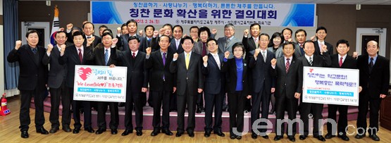 도교육청은 이날 양성언 교육감과 김화진 부교육감, 강덕부 제주시교육지원청 교육장, 김철호 서귀포시교육지원청 교육장, 문용길 탐라교육원장, 현성우 제주교육과학연구원장, 양정희 제주국제교육정보원장, 장명선 제주학생문화원장, 강상인 서귀포학생문화원장, 정순식 제주교육박물관장, 이승헌 제주도서관장, 현연숙 제주유아교육진흥원장 등 28명이 참여한 가운데 도교육청 제3회의실에서 결의대회를를 갖고, 칭찬하는 학교 문화 확산을 위해 총력을 기울일 것을 다짐했다.