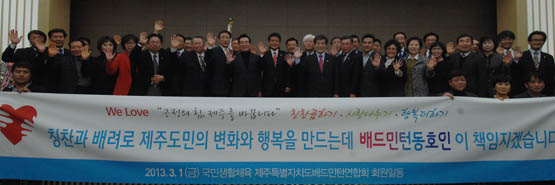 배드민턴연합회는 이날 우근민 제주도지사를 비롯해 제주도의원, 연합회회장단, 운영위원, 일반회원 등 200여명이 참여한 가운데 제주국제컨벤션센터에서 'We♥' 동참 결의대회를 개최했다.