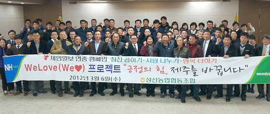 성산농협 임·직원 92명은 6일 오후 6시30분 열린 직원조회에서 제민일보가 도민 대통합 발판 마련을 위해 추진중인 'WeLove(We♥)'프로젝트에 적극 참여, '칭찬문화가 넘치는 성산농협'을 만드는데 적극 나서기로 약속했다.