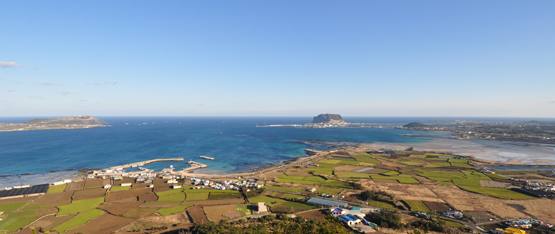 정상에 서면 360도 완전히 오픈된 시야다. 산과 바다·들 제주의 모든 것들을 시원스레 펼쳐진다. 청명하게 쏟아지는 봄 햇살 아래 일출봉과 우도, 눈이 시리도록 푸르게 빛나는 바다, 새싹이 돋아나는 밭과 돌담 등이 어우러져 한 폭의 풍경화를 방불케 한다. 오름 남쪽 자락 '자리코지' 안쪽 전답들이 제주 최초이자 최대의 '전오(煎熬)염전'이 있었던 '소금밭' 터다.