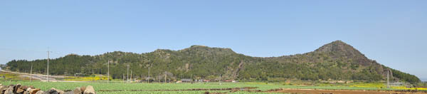 정상부의 풍광은 압권이다. 남쪽으론 오름 앞의 들판과 왼쪽의 장엄한 산방산, 바로 이어지는 바다, 그 가운데 앙증맞게 마주 서 있는 형제섬, 그리고 다시 바다와 송악산, 그 뒤 직선상으로 이어지는 가파도와 마라도 등 그야말로 장관이다. 그 서쪽은 일제 수탈의 역사적 현장인 알뜨르비행장과 모슬봉이 이어진다. 북쪽은 멀리 한라산을 배경으로 병악·원수악·정물오름·금오름 등 제주 서부의 오름군들이 봄볕에 반짝인다.