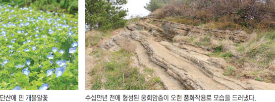 출발해 2분이면 퇴적암 층이 평평하게 형성된 전망대(〃C)다. 왼쪽의 산방산을 시작으로 형제섬과 송악산 등 제주의 바다와 들이 파스텔 톤으로 이어지며 한 폭의 시원한 풍경화로 다가온다.