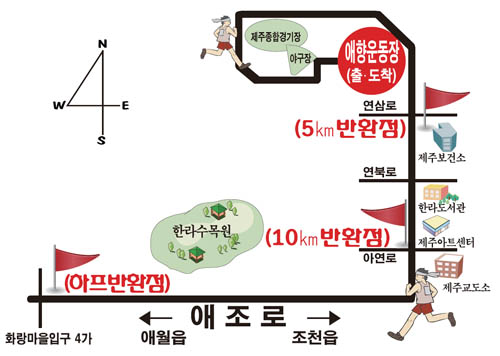 하프 마라톤은 10㎞ 반환점에서 계속 진행, 아연로와 오남로 교차로를 지나 애조로 애월방향인 오른쪽으로 돌아 노형교차로와 큰내도교차로 다음 화랑마을 입구 4가 반환점을 왕복, 애향운동장으로 골인하는 코스입니다. <제민일보사>