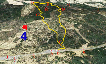 ▲ <미악산 탐방로> A=주차장 B=탐방로 입구 C=코스 갈림길 D=야영장 갈림길 E=제2봉 정상 F=주봉 정상 G=야영장 갈림길 H=분화구 I=영천 난대림 J=전망대 K=산록남로 L=동홍로