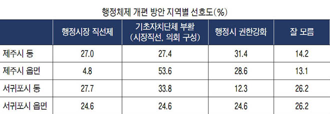 제주시 동 지역은 행정시 권한 강화(31.4%)를 선호했으며 기초자치단체 부활(27.4%), 행정시장 직선제(27.0%) 순으로 꼽았다.