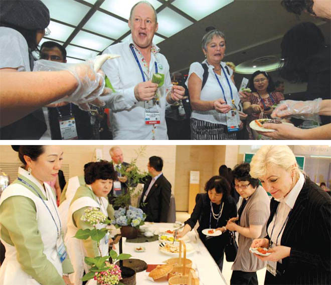 ▲ 지난해 세계자연보전총회 참가자들이 빙떡과 오메기떡 등 제주 전통향토음식을 먹어보고 있다.(사진 위) 탐라차문화원은 '제주의 다과' 홍보부스를 마련, 국내·외 참가자들에게 제주의 맛을 선보였다.(사진 아래)