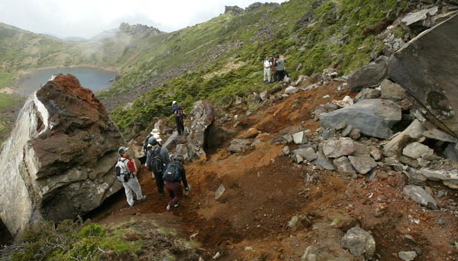 며칠 전 한라산연구소 관계자들과 함께 인문자원 조사차 백록담에 다녀왔다. 옛사람들의 백록담 등반 흔적인 마애명을 둘러본 후 방암, 산신제, 혈망봉 추정지역을 돌아보다 깜짝 놀랄만한 모습에 충격을 받았다. 얼마전 100㎜ 가까운 폭우가 쏟아진 직후 때문인지는 모르지만 백록담 북쪽 사면을 보니 예전과 비교할 때 너무나도 심하게 훼손된 것이다.