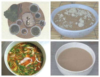 ▲ 왼쪽 위부터 시계방향으로 여름밥상·보리게역·보리쉰다리·오징어냉국. 사진=전통향토음식 발췌