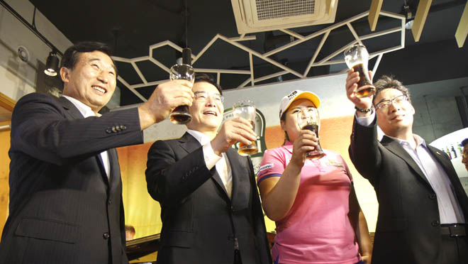 ▲ 24일 제주시 연동 옛신제주종합시장 건물에 마련된 제주맥주 전용매장에서 '제스피' 출시 기념행사가 열려 본격적인 시장 진출을 열었다. 사진 왼쪽부터 오재윤 개발공사 사장, 우근민 지사, 프로골퍼 박인비, 박희수 도의회 의장.