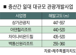 아덴힐리조트 개발사업(2800억원)은 해발 440∼520m(한림읍 금악리), 차이나비욘드 힐 관광단지 조성사업(7410억원)은 해발 435∼520m(애월읍 봉성리), 백통신원 제주리조트 개발사업(2432억원)은 해발 255∼360m(남원읍 위미리)에 추진되는 등 해안과 한라산을 조망할 수 있는 경관지에 대규모 관광개발사업이 이어지고 있다.