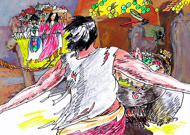 논광 밧은 반반인디 밧이 꼼 하고, 논은 저실에 파종영 5월이문 다 익엉 거두와뒁 7월에 또 싱겅 저실 들어가문 다시 거둔다. 밧은 저실에 삽으로 익영 조를 싱겅 5월에 거두와 뒁 6월에 다시 싱겅 저실 나가문 거두곡 해에 두 번 농짓는다. 밥은 곤밥 곡 소금이나 장 놩 국을 끌리는디, 키나 궤기를 논다. 술은 청주와 탁베기가 신디, 납펭에 담앙 은잔(銀盞)으로 먹는디도 술맛은 우리광 벨로 달르지 아니다. 또시 남만국(南蠻國) 술이 신디, 누렁 게 소주 맛 나멍 무장 독영 두어 잔만 먹으문 씨러진다.