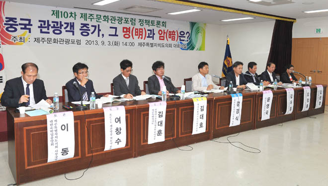 제주특별자치도의회 의원연구모임인 제주문화관광포럼이 주최한 '중국 관광객 증가 그 명과 암' 정책 토론회가 3일 오후 2시 의회에서 열린 가운데 이날 참석자들은 중국 관광객의 급격한 성장 뒤 숨겨진 저가 여행상품, 무자격 관광가이드·여행사 난립에 따른 시장질서 문란 등의 문제를 해결해야 한다는데 의견을 모았다.